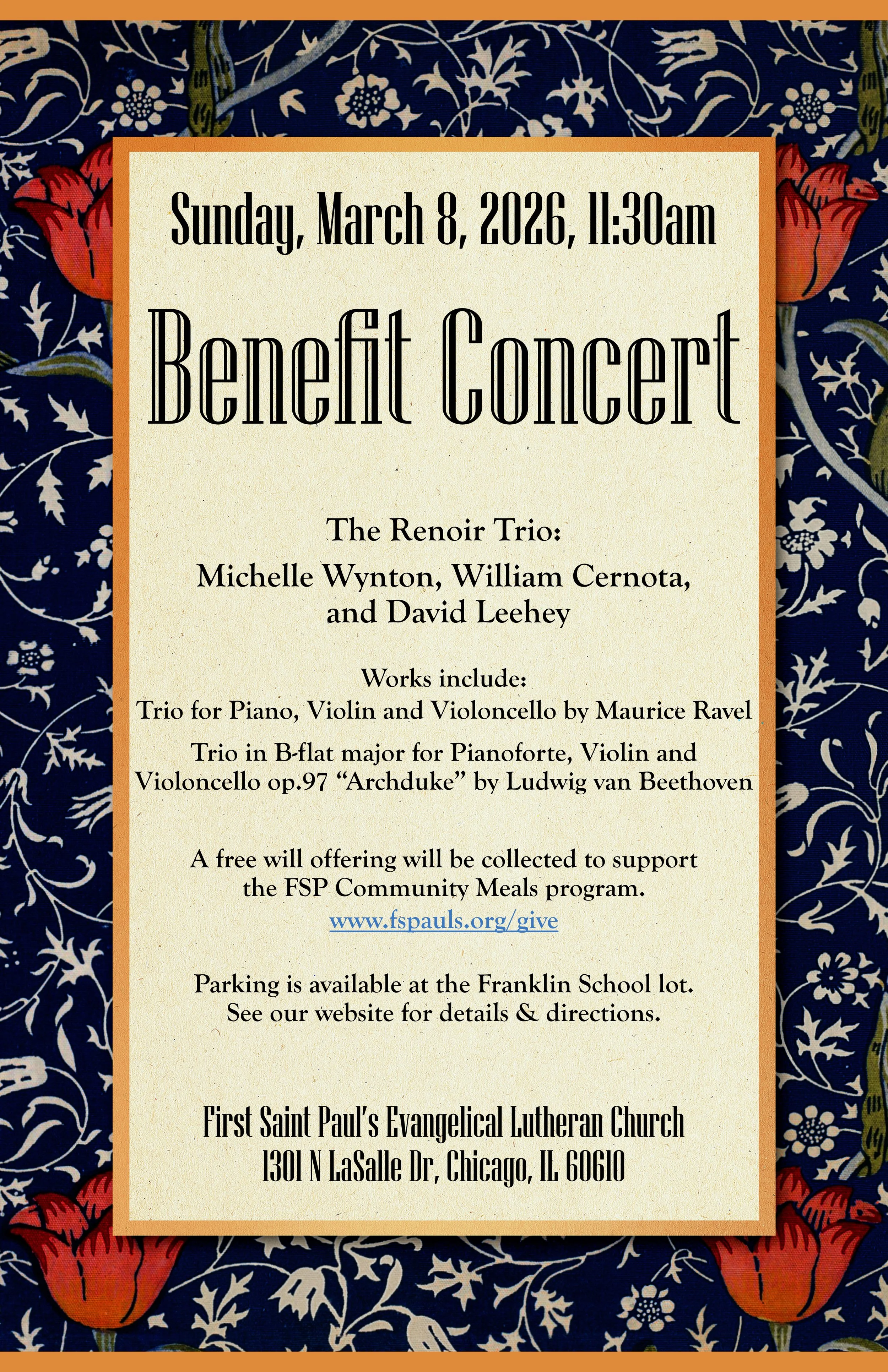 Free parking is available at the Franklin School parking lot two blocks west of the church.